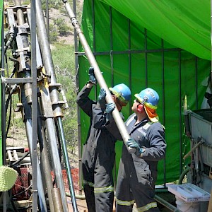 Diamond drillers replacing the core barrel, Coneto property.