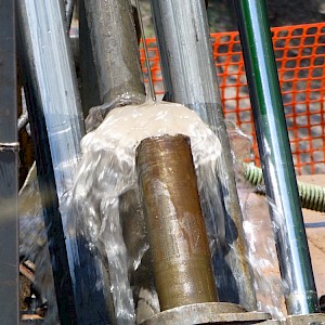 Water plume above core barrel recovery, Coneto property.