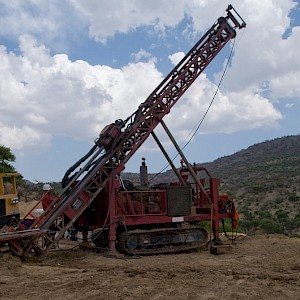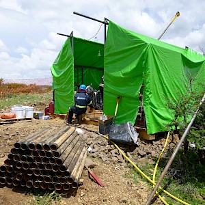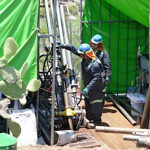Diamond drillers adjusting the drill head, Coneto property.