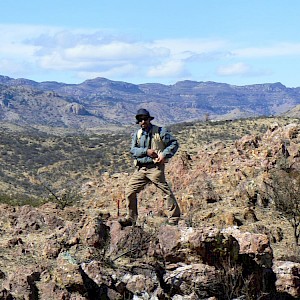 Geologist Miguel Davila above the Caleveras Vein, Coneto property.
