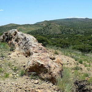 North Shaft with rhyolite mesa in the distance, Coneto Mine, Coneto property.